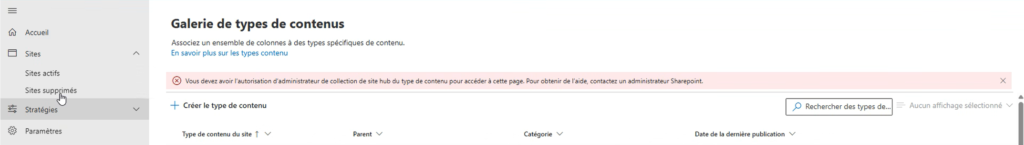 Pour accéder à la Galerie de types de contenus, il faut être Administrateur de la collection de sites du Content Type Hub.