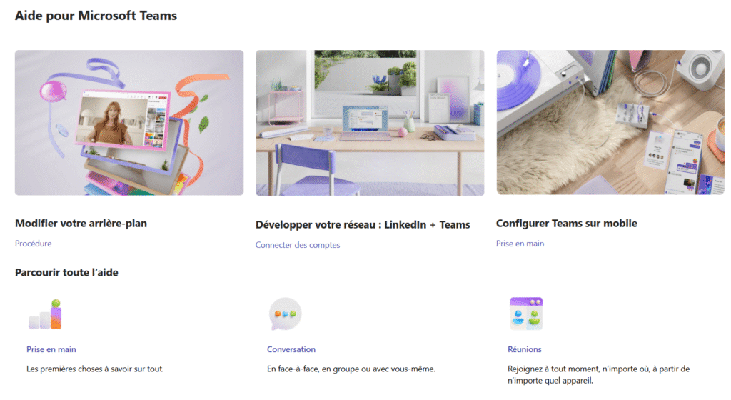 La première section, “Aide”, agit comme un centre de documentation vivant. On y trouve des guides illustrés, des conseils pratiques et des rubriques thématiques qui couvrent tous les aspects de Teams : la gestion des conversations, les réunions, les équipes et canaux, les notifications, les appels, les fichiers, les applications ou encore la résolution de problèmes. Tout y est pour aider les utilisateurs à maîtriser la plateforme, qu’ils soient débutants ou expérimentés. En un clic, il est possible de découvrir comment modifier son arrière-plan, connecter LinkedIn à son profil Teams ou encore configurer l’application mobile. Ce premier onglet est, en somme, le manuel d’utilisation interactif de Teams, toujours à jour et directement accessible depuis l’environnement de travail.