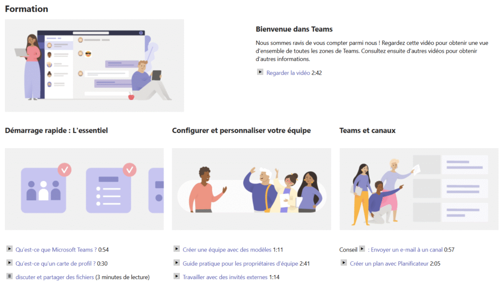 Vient ensuite l’onglet “Formation”, qui transforme Teams en une véritable académie numérique. Microsoft y propose des vidéos courtes et dynamiques, rarement plus de deux minutes, sur toutes les fonctionnalités clés : planifier une réunion, partager des fichiers, gérer des notifications, organiser un webinaire ou encore utiliser les applications mobiles. L’approche est pratique, simple et efficace. Chaque capsule vidéo ou article est conçu pour permettre à l’utilisateur de se former de façon autonome, au moment où il en a besoin. C’est une manière concrète d’encourager l’apprentissage en continu et l’adoption naturelle des outils numériques, sans devoir passer par des formations formelles.