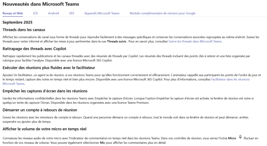 Enfin, la section “Nouveautés” joue le rôle de bulletin d’information mensuel. On y retrouve les mises à jour et les nouvelles fonctionnalités classées par environnement : Bureau et Web, iOS, Android, VDI, appareils Teams ou encore module complémentaire Google. Cette partie, souvent négligée, est pourtant essentielle pour ceux et celles qui veulent rester à jour sur l’évolution rapide de Teams. C’est une forme de veille technologique intégrée, parfaite pour les responsables TI, les gestionnaires ou les utilisateurs curieux de découvrir les nouveautés avant tout le monde.