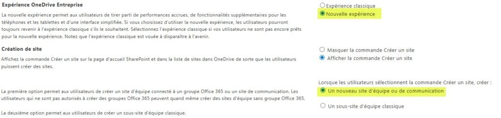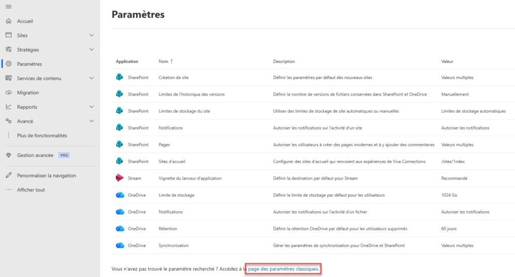 L’expérience moderne est désactivée par défaut pour certaines collections de sites. Pour l’activer globalement via le Centre d’administration SharePoint :