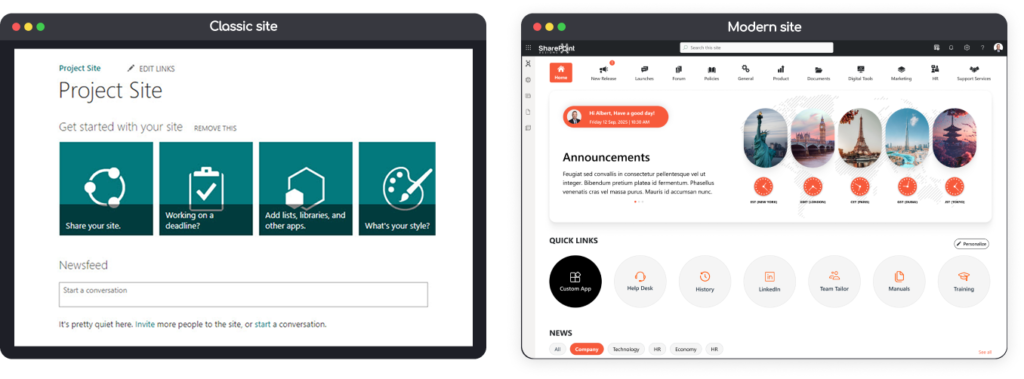 | Gestion du contenu | Pages Wiki ou Web Part Pages, édition limitée. | Pages modernes avec éditeur riche et bibliothèques améliorées avec vues JSON. |