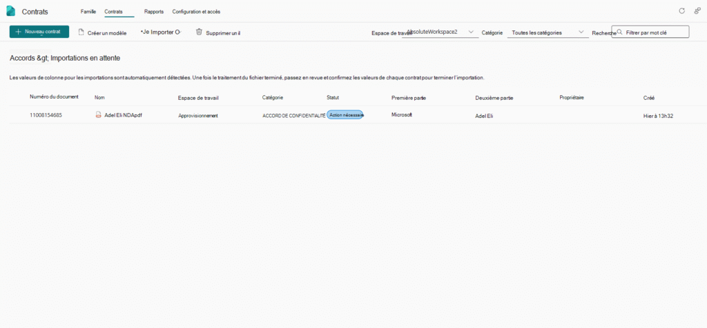 Une fois le modèle publié, on le lie à la bibliothèque “Agreements”. À partir de ce moment-là, tout nouveau contrat importé est automatiquement analysé et classé.