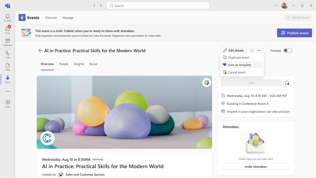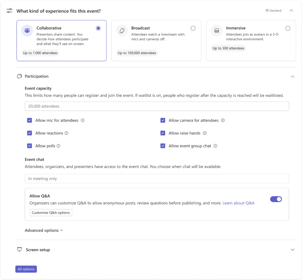 Les organisateurs utilisent désormais un flux de création unique pour configurer un événement quel que soit son format. Les paramètres de diffusion les rôles les options d’engagement et l’accessibilité sont définis au même endroit.