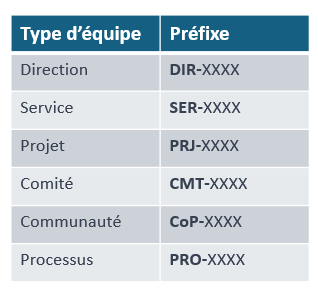 Une direction, un service, un projet, un comité, une communauté ou un processus : chaque type d’équipe a son propre rôle et un préfixe normalisé.